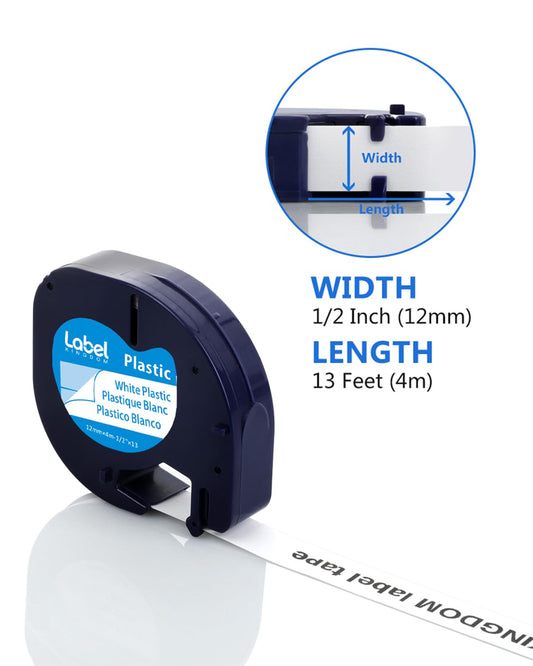 Label KINGDOM Compatible Labels Replacement for DYMO LetraTag Refills 91331 White Plastic Label Tape 12mm x 4m (1/2'' x 13') for Dymo Letra Tag Label Maker LT100H LT100T QX50, Black on White, 5-Pack