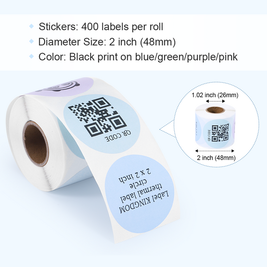 Label KINGDOM 2 Inch Thermal Label, Black on Pink/Blue/Green/Purpel, 1 Roll of 400 Circle Sticker Self-Adhesive Round Label for Multi-Purpose use, Compatible for Direct Thermal Printer